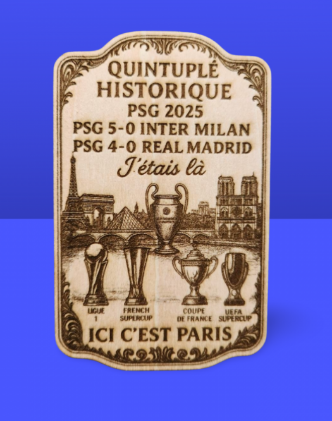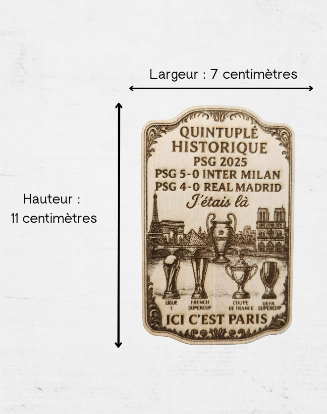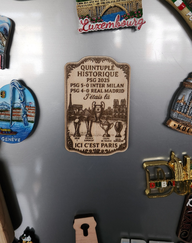 • Magnet souvenir en bois gravé célébrant la quintuplé historique ( Champions league, Ligue1, Supercoupe, doupe de france, UEFA supercup) du PSG en 2025.
